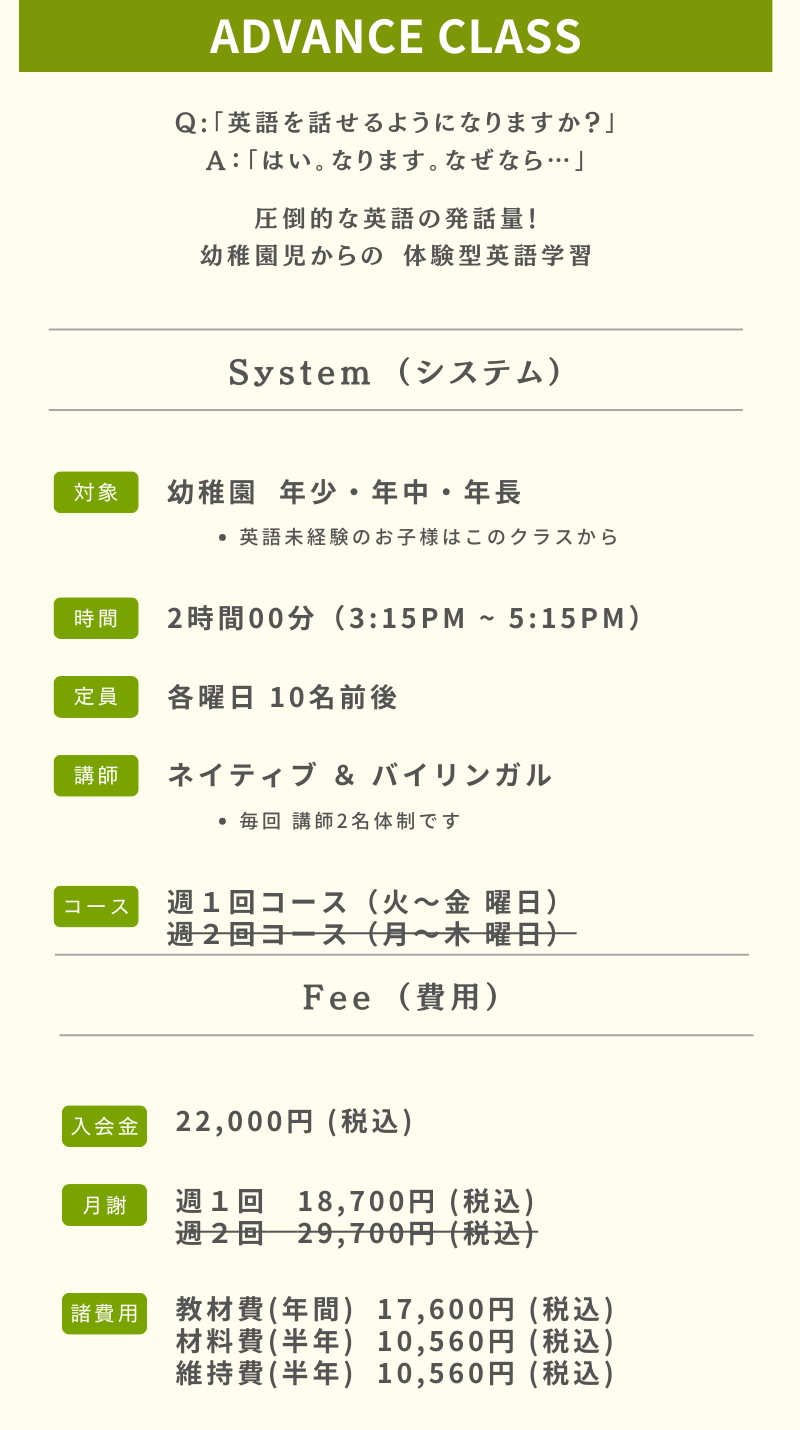 子ども英語教室 アドバンスクラス/幼稚園 年少 年中 ADVANCE(幼稚園児からの英会話)アフタースクール